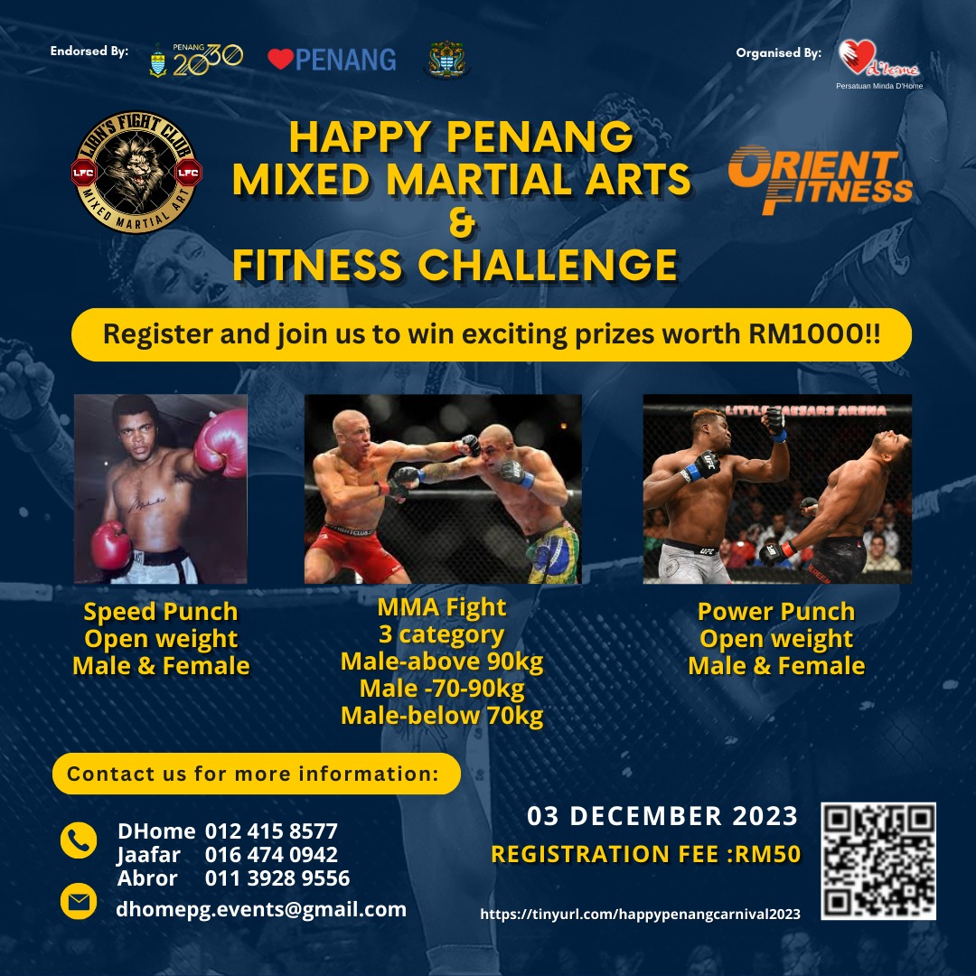 In the spirit of fostering community, promoting mental health awareness, and celebrating joy, a special event is set to dazzle Penang on December 3—the Happy Carnival! Organized by Persatuan Minda D’Home, leading mental health association in Penang, this vibrant event promises a day filled with exhilarating challenges, creative expressions, and a heartfelt connection with the rich heritage of Penang. Prepare to be enthralled by the MMA Fitness Challenge, Children's Coloring Contest, and Heritage Fun Walk as they unite for a greater cause.