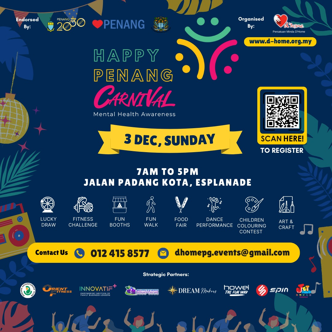 Be part of an event that brings together the power of community, the joy of celebration, and the dedication to mental health awareness. The Happy Carnival on December 3 is an opportunity to unite for a cause and create lasting memories. Come, share your smiles, and join hands with us as we celebrate togetherness, creativity, and the rich heritage of Penang. Save the date and be ready for an unforgettable carnival experience that promises laughter, compassion, and an unbreakable sense of community!