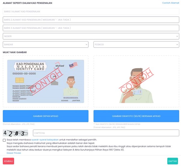 The form will update to show your selfie photo with your MyKad crossed out with Untuk Kegunaan SPR Sahaja (For SPR Use Only) in red.